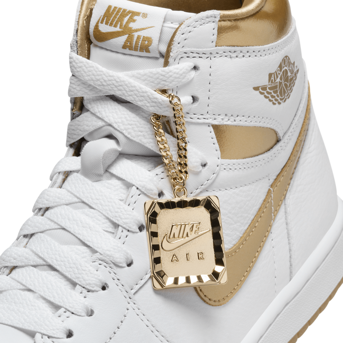 The Air Jordan 1 High OG “Metallic Gold” features a full leather upper. The upper will be found in sleek White tumbled leather, with Metallic Gold accents found on the ankle collar, inner lining, and Nike Swoosh. We'll also find a special Metallic Gold "Nike Air" hangtag on the laces. The midsole will be found in White, sitting atop a Gum rubber outsole to finish off the look.