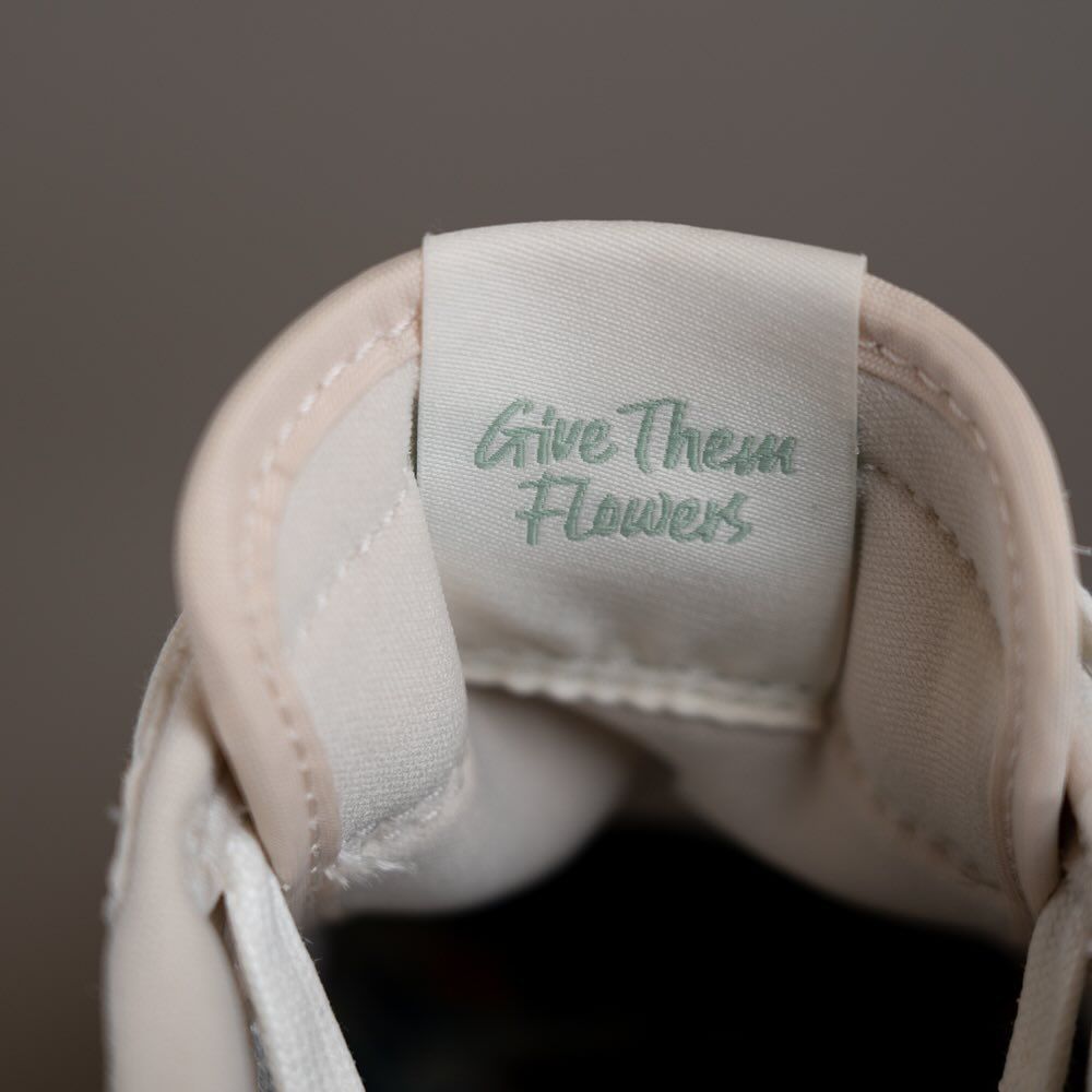The “Give Them Flowers” special edition low top has a white-on-white upper and an embroidered floral pattern covering nearly every inch. A pail yellow hairy suede swoosh, tongue, toe box, and the phrase “Give Them Flowers” are branded on the tongue tab. The undercarriage comprises a sail midsole and a translucent outsole with additional floral detailing inset.