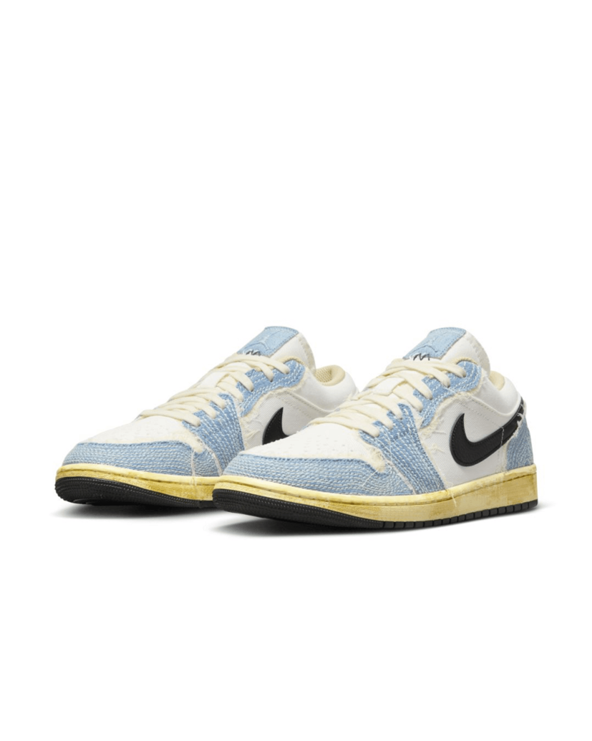 Nike is taking a new approach to style on its Air Jordan 1 Low, putting a spotlight on craftsmanship with the Sashiko design. Overlays resembling denim have been strategically placed on the front part of the shoe, the tongue, and the heel area, infusing a touch of light blue into the palette. What's more, these fabric panels showcase a classic white stitching pattern that's deeply rooted in the traditions of Japanese craftsmanship. The Nike Dunk Low, featuring nearly identical design elements, has also embraced these thematic cues, serving as an additional tribute to the culture of the Far East. The foundational layers of the shoes have been kept elegantly straightforward, providing the perfect backdrop for the pronounced black swooshes on the sides. Moving down to the midsoles, an aged arrangement has been skillfully incorporated, harmonizing beautifully with the essence of the traditional sashiko technique.