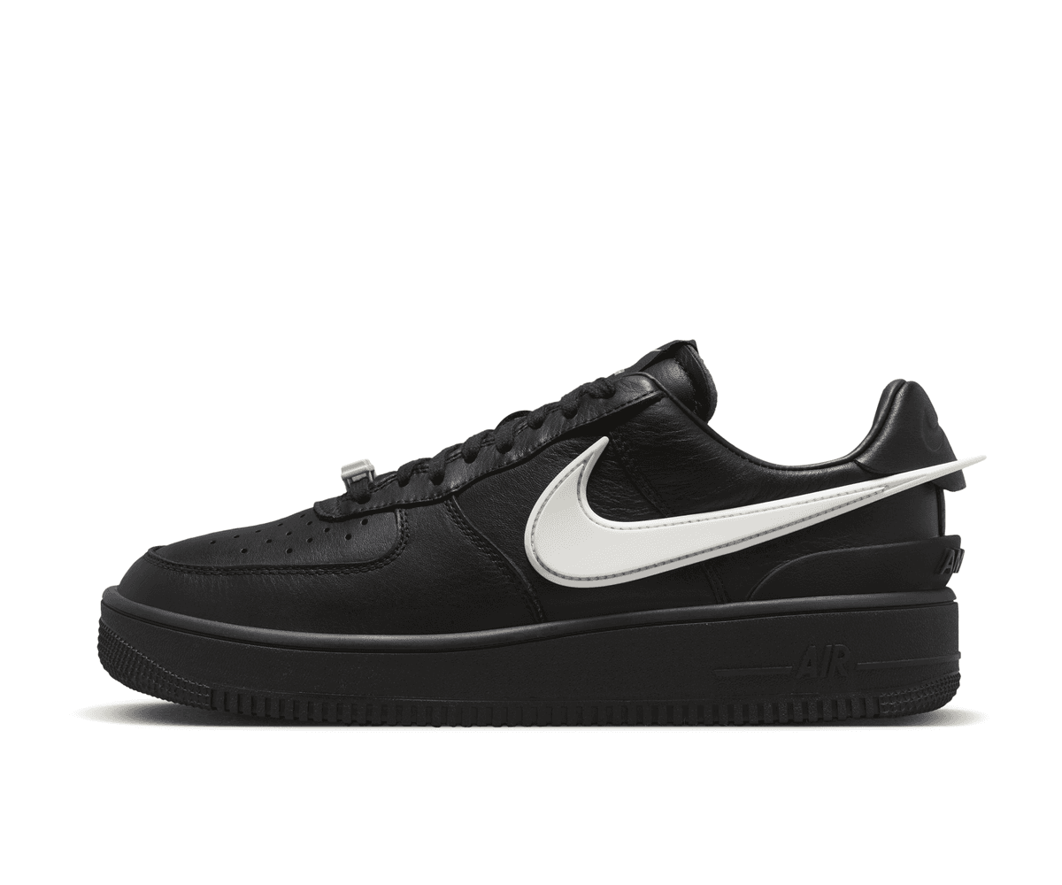 The sneaker has a black base and fine leather overlays that give it a sleek, upscale appearance. The white Swoosh that runs along the medial and lateral sides of the sneaker is overstated in this style, and it is the focal point. The AMBUSH x Nike Air Force 1 Low Black stands out from the competition and is guaranteed to draw attention thanks to its distinctive take on the iconic Nike emblem. The co-branding on the tongue tag gives the shoe a hint of subtle luxury, while the white lace dubrae adds a splash of contrast to the black base. The AMBUSH logo on the heel clip is the ideal finishing touch, enhancing an already gorgeous design with an additional level of flair and sophistication.