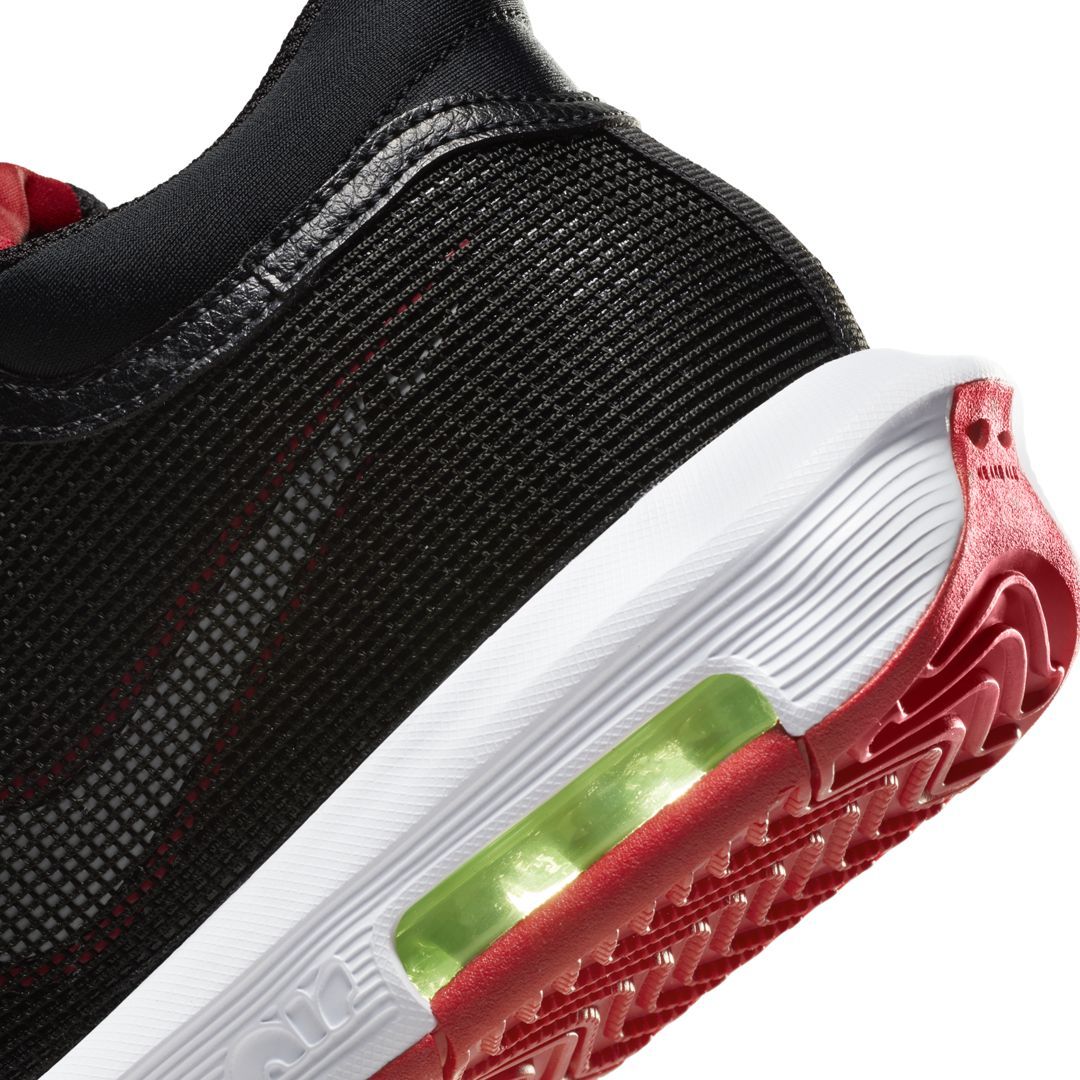 The Faze Clan x Nike LeBron Witness 8 has a black mesh upper with a university-red and white swoosh hidden just beneath the surface. A red neoprene forefoot strap transitions right into the tongue with the King James logo and Faze Clans emblem on the other. A thick white midsole and red outsole encapsulate an exposed lime-blast air bubble unit on the heel.