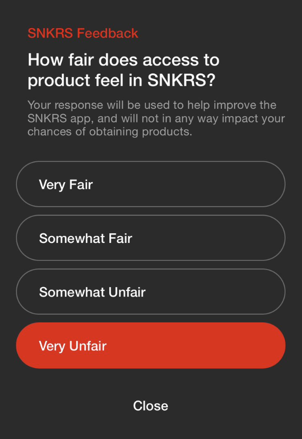 In a bid to enhance user experience, the SNKRS app has initiated feedback loops, prompting users with questions about its fairness. One such question posed recently was, "How fair does access to product feel in SNKRS?" Options provided ranged from "very fair" to "very unfair."