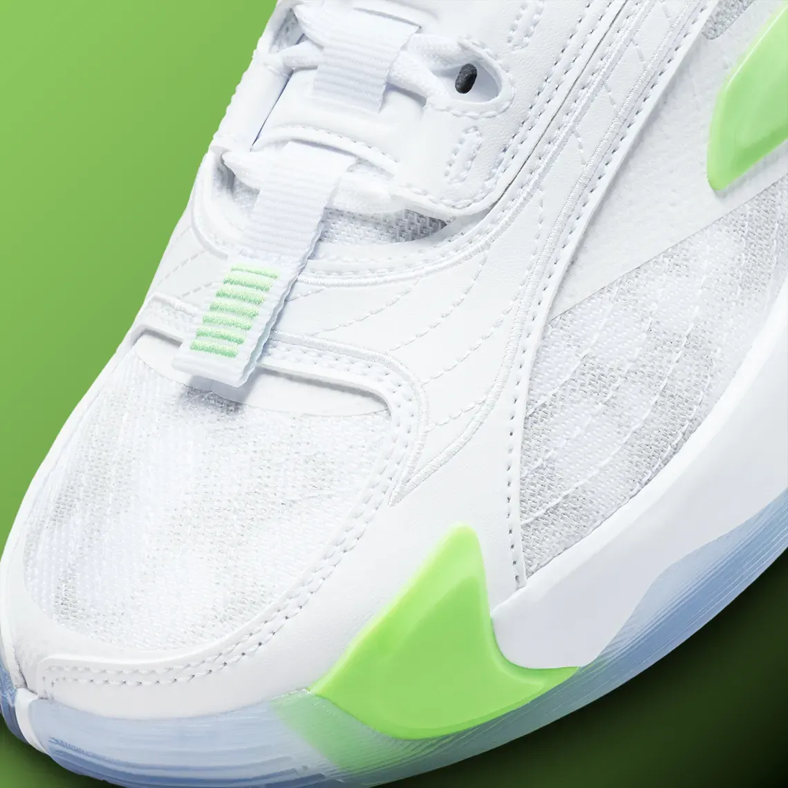 The Jordan Luka 2 “Trick Shot” features a mesh base layer, and leather overlays. The upper will be fully comprised of a white-out design, with the mesh layer being semi-transparent. A highlight of the Jordan Luka 2 is the use of the IsoPlate foot frame, which wraps and helps contain the foot. You can find the IsoPlate on this colorway in the lime green accent. The midsole will be white, featuring full-length Formula 23 foam and the medial Cushlon 3.0 wedge foam in dark gray. To finish the look, we'll find a transparent rubber outsole