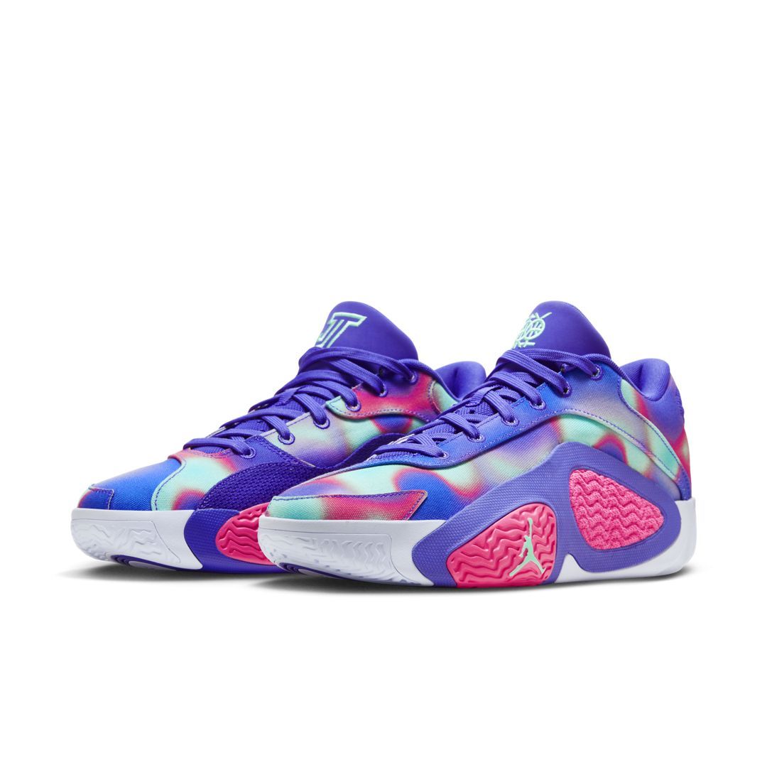 The Jordan Tatum 2 “Dongdan” features a colorful color palette including Indigo Burst, Palest Purple, Hyper Pink, and Green Glow hues. The upper will be found with a breathable mesh base layer, and leather overlays in a colorful tie-dye pattern showcasing bright shades of Blue, Pink, and Green. The tongue, laces, and heel will be found in Purple, with Indigo accents found on the "JT" logo on the tongue and the Jumpman logo on the heel. We'll also find the large textile pods on the lateral side, overlaying the midsole. Dressed in Hyper Pink and outlined in Purple, these pods not only provide for a unique aesthetic, but also provide for superior stability. Finishing off the look, we'll find a simple White rubber sole.