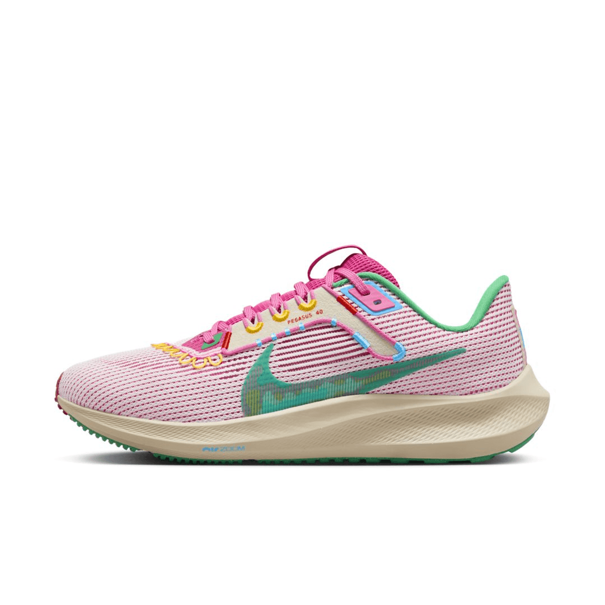 The Nike Air Zoom Pegasus 40 “Familia” will feature a textile upper encased in a pink/white crossover design. The rest of the upper will showcase a variety of colors, including the tongue and laces in pink, the inner lining in green, and bits of yellow on the eyelets. Familia branding will also be found on the tongue tab, rear heel, and custom insoles. The Nike React foam midsole is in a light brown color, with a multicolored outsole to finish the look.