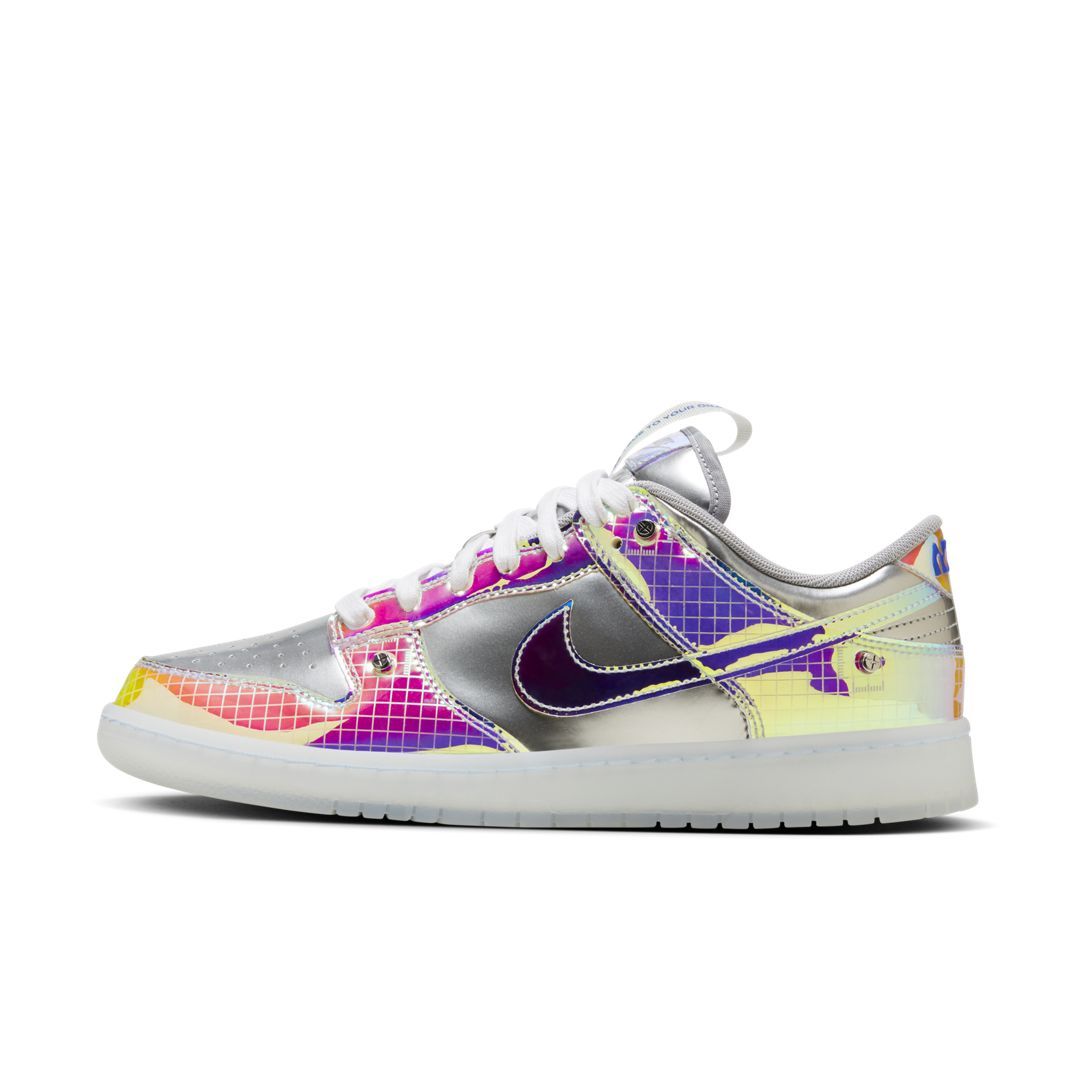 The Nike Dunk Low Be True 2023 features a unique and outgoing design with gradients, shiny silver, and reflective materials. The base leather layer will be found in Metallic Silver, with the overlays in a colorful gradient with a white grid background. The Nike Swoosh will be found in the same gradient design as the overlays, as will the heel tab. You'll find "Be True" branding on the tongue tabs, and insoles. To finish the look, we'll find a semi-translucent rubber sole that perfectly fits the sneaker.