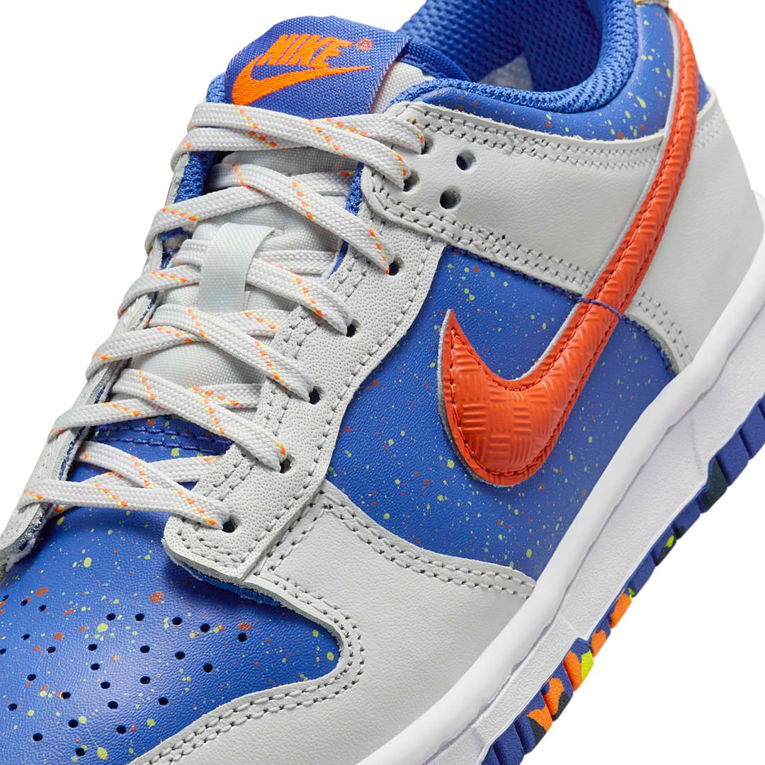 The Nike Dunk Low GS “Paint Splatter” features a color palette including Photon Dust, Astronomy Blue, Volt, and Total Orange hues. The base leather layer will be found in Blue with a paint splatter effect. The overlay will be found in Photon Dust, with the Nike Swoosh found in a vibrant Orange hue. The mesh inner lining will be found in Blue, and Nike branding on the tongue tab found in Orange. Finishing off the look, we'll see a White midsole sitting atop a multicolored rubber outsole.