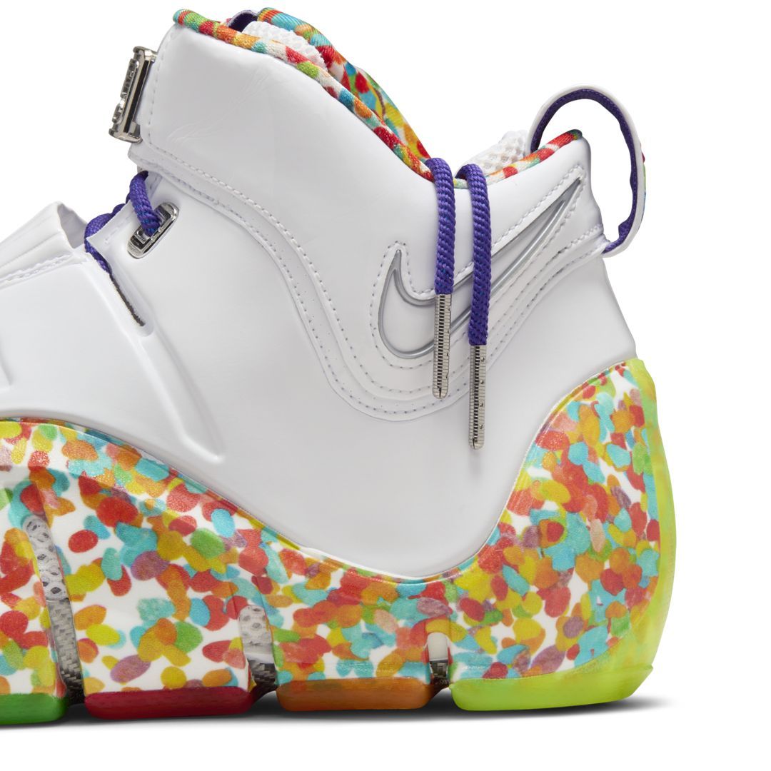 The Nike LeBron 4 "Fruity Pebbles" was originally released back in 2006 as a Player Exclusive, but was rumored to be released in Holiday 2022. We're now finally getting to get our hands on this exciting colorway this Spring season. This colorway features a very similar design to the original 2006 release, featuring a color palette including White, True Red, Mean Green, and Varsity Purple hues. The upper arrives in White leather, with Fruity Pebbles details found on the inner lining and midsole. Purple laces, Metallic Silver LeBron branding, and a multicolored semi-transparent rubber outsole finishes off the look. Co-branded features can be found on the inner tongue, insoles, and "FAMILY SIZE" branding on the pull tab.