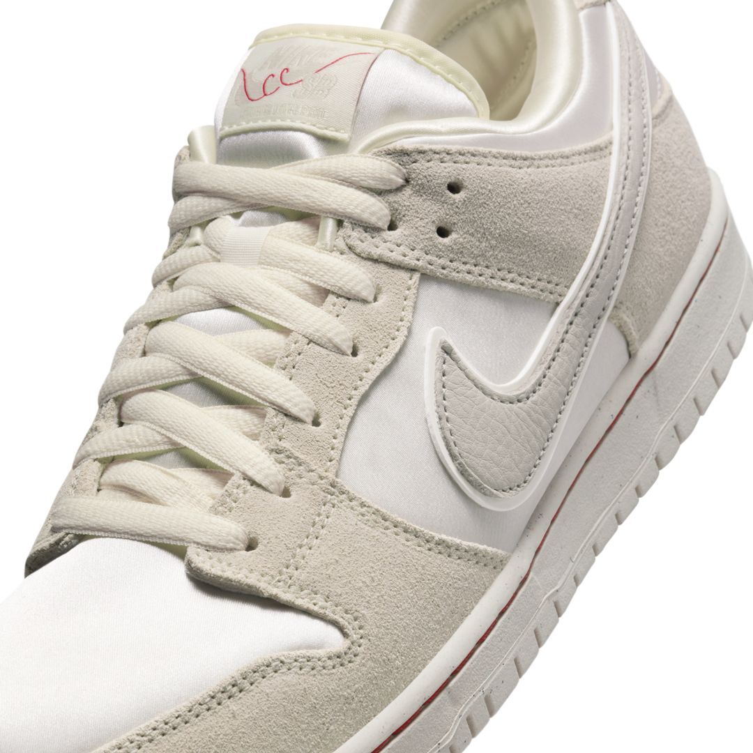 The Nike SB Dunk Low City of Love Light Bone definitely does not disappoint regarding looks. The base layer will be found in silver satin with plush suede overlays. The Nike Swoosh will be found in a gray tumbled leather, with a special Nike SB tab decorated with a red string. This shoe will also feature a unique insole, featuring a hand with a red string tied to its pinky finger, symbolizing the bond between soulmates. To finish the look, we'll see a white rubber sole featuring a band of red stitching.