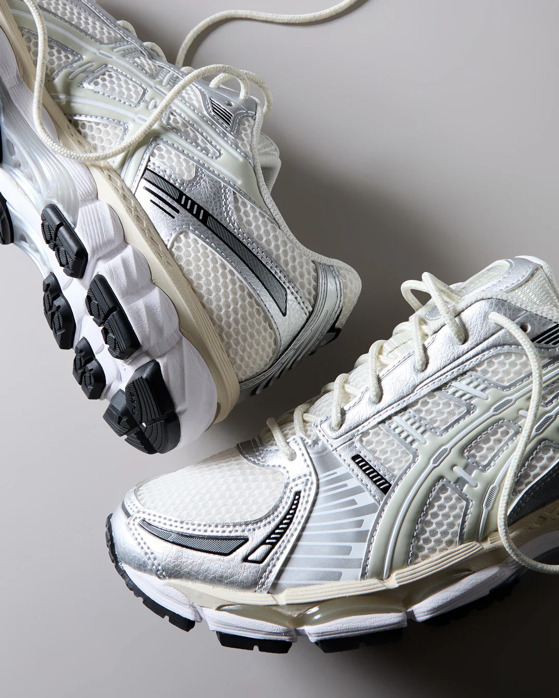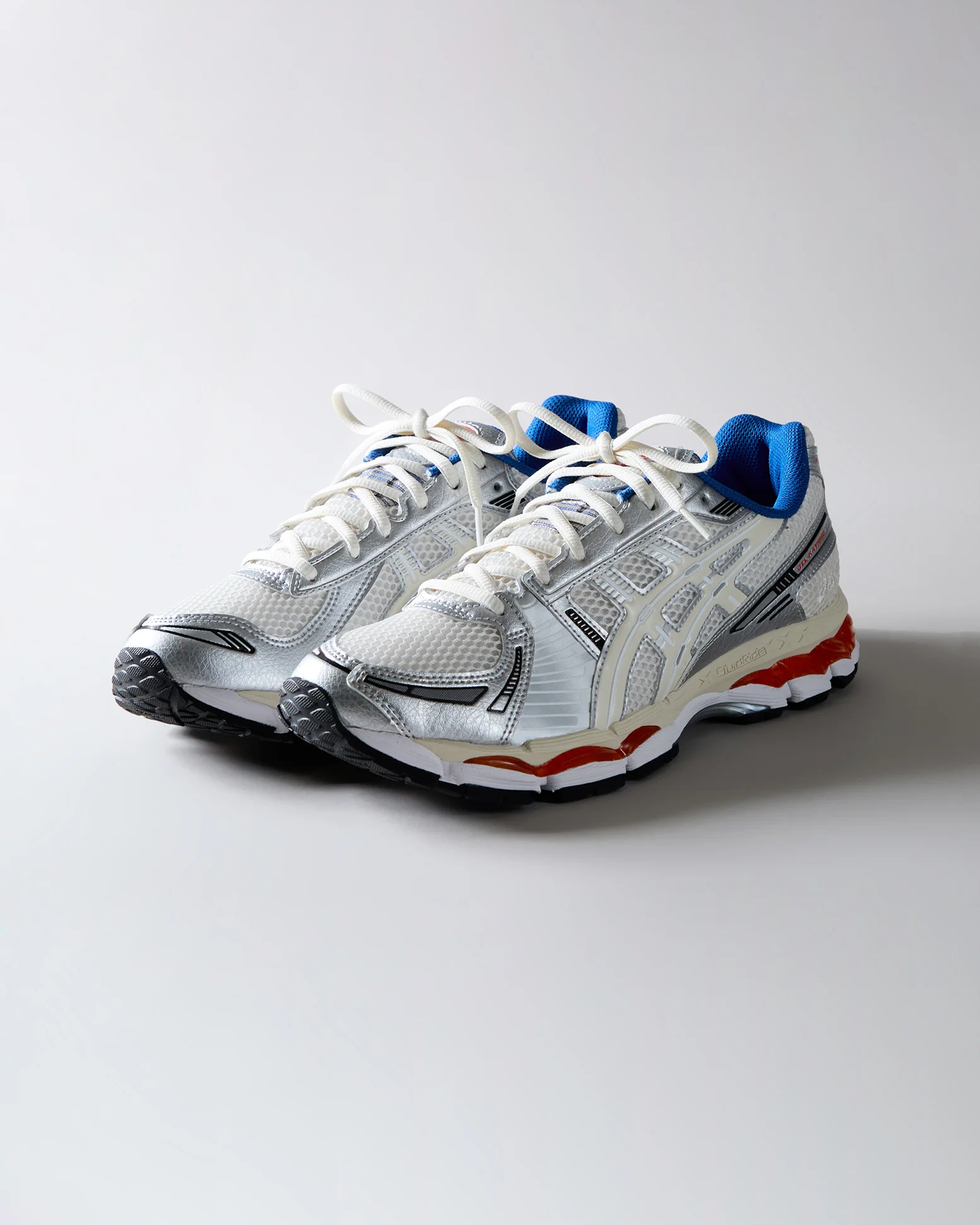 The Ronnie Fieg x ASICS GEL-Kayano 12.1 Pack will feature two minimal designs, both predominately featuring a clean White/Silver look. The GEL-Kayano 12 features a classic mesh base layer, accompanied by leather overlays, SOLYTE Foam and the famous GEL cushioning in the midsole. The first pair arrives in a more muted look, with a Cream midsole and Olive accents. Another more vibrant pair arrives with a Blue mesh inner lining, Cream midsole, and bright Orange accents.