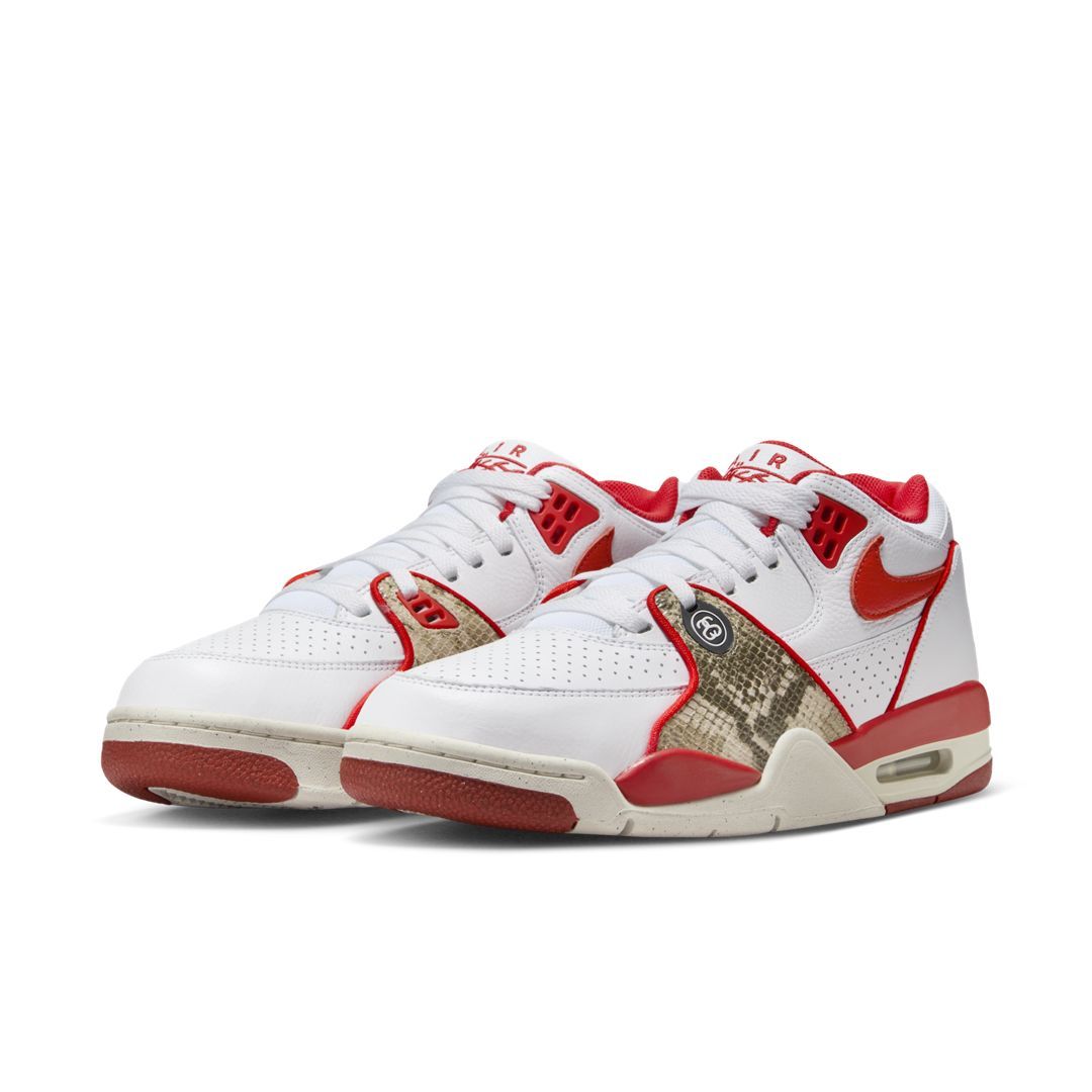 The collaborative release introduces the Air Flight 89 in three new colorways: White/Habanero Red, Black/White, and White/Pecan. Crafted with leather, these sneakers boast perforated panels for enhanced breathability, mesh collars, and lower tongues for added comfort. Standout features include the Stussy "SS" logo overlaid on snakeskin textures, accompanied by Stussy's branding beneath the "AIR" emblem on the leather tongues. The design is rounded off with "Nike Air" branding on the heels and a visible Air unit in the rear midsole, packaged in specially co-branded packaging.