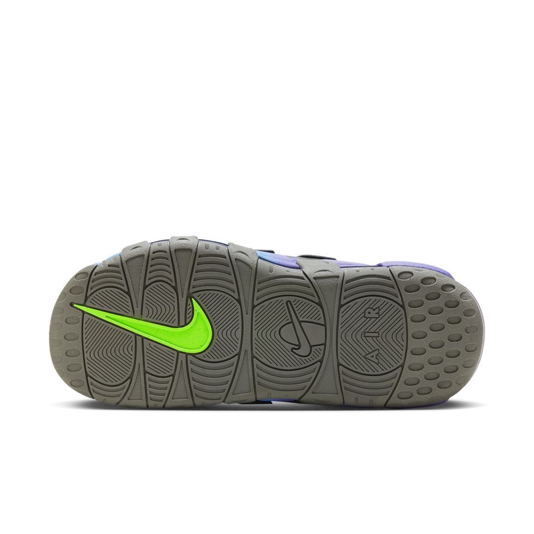 The newest Air More Uptempo Slide shows a dark presentation with a black nubuck foot strap. The signature "AIR" embossments are textured with snakeskin-like leather and a volt-green swoosh across the top. The midsole features the exposed rear air bubble and transitions from purple to blue.