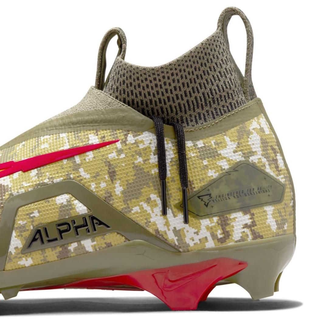The Nike Alpha Menace Elite 3 Travis Kelce showcases a captivating digital camo pattern that elegantly envelops the upper part of the shoe. This camo design combines tones of tan, white, red, and yellow, creating an eye-catching and appealing visual effect. To ensure a snug and secure fit, the shoe features an internal bootie that delivers stability during gameplay. Adding to the burst of colors, the Swoosh logo on both the front and inner side of the shoe stands out in a bold combination of red and orange. Personalizing this special edition, the Travis Kelce branding is prominent on the insole. Lastly, the cleated outsole guarantees the necessary traction and control while on the field.
