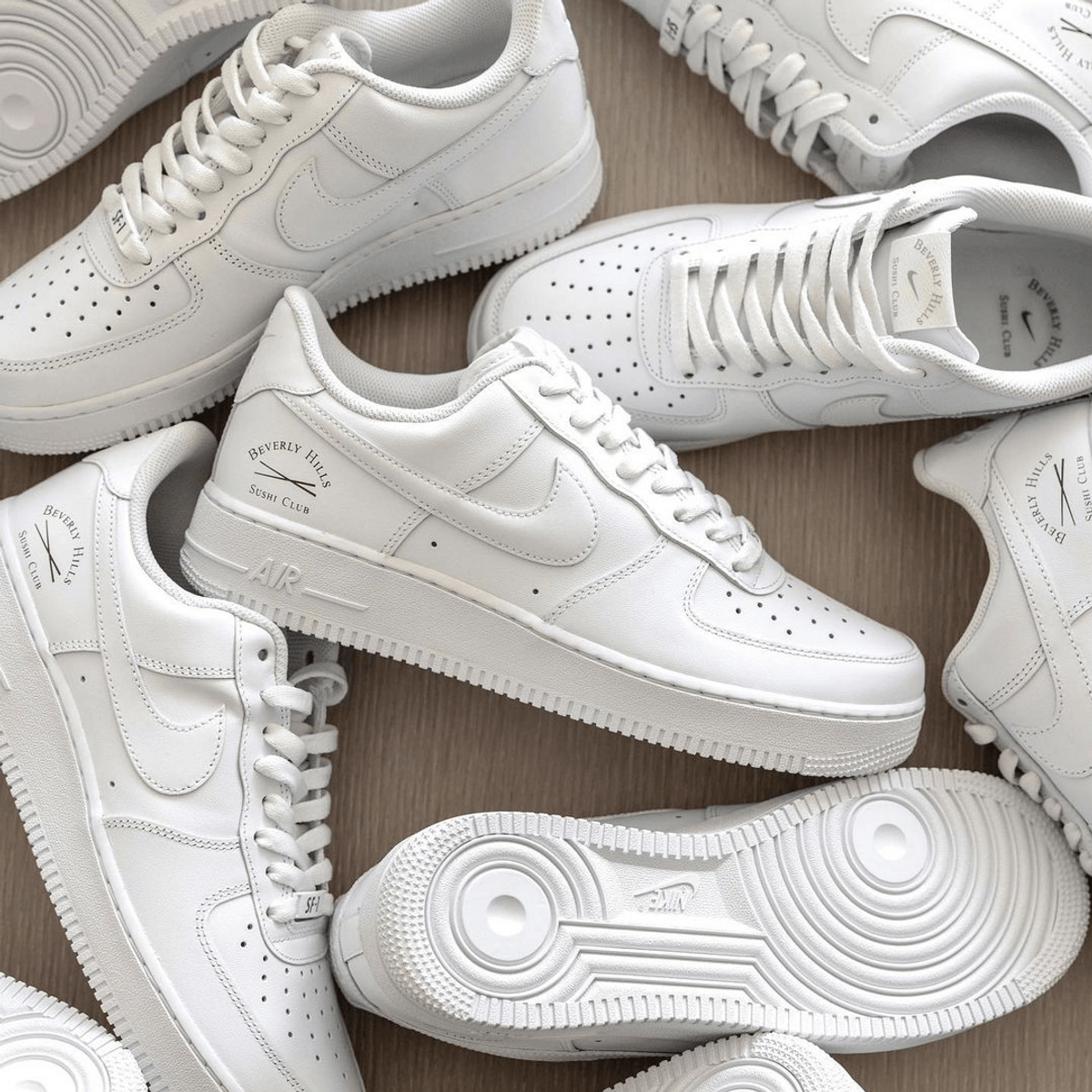 One of the most iconic shoes ever created was the Air Force 1 Low, this particular model is coined the Sushi Club x Nike Air Force 1 Low Sushi Force. When first looking at the kicks you wont notice many differences from a regular White Air Force 1 Low. The difference is in the details, Beverly Hills Sushi Club is laser engraved into the heel and the same branding can be found on the tongue tag. The laces tie together the collab with Stampd and Matsuhisa branding, along with "SF1" on the dubrae as a nod to the Sushi Force.