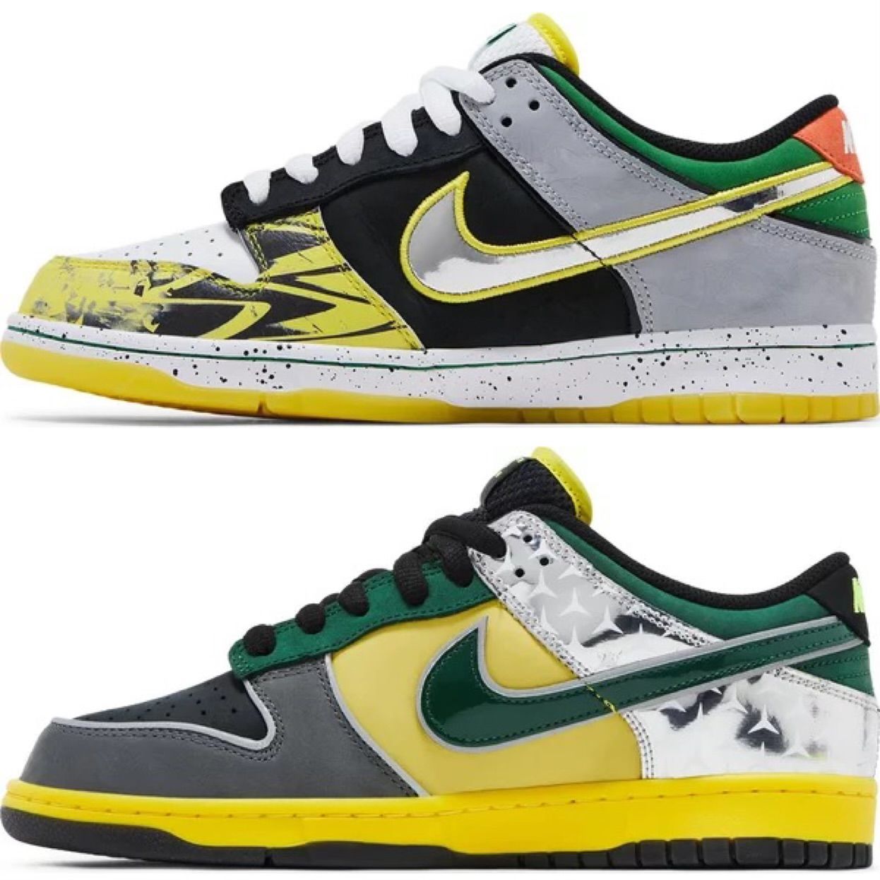 The pack features two distinct colorways, "Home" and "Away", each telling a unique story through color and material. Both designs incorporate iconic green and yellow, reflective of Oregon's colors, but they diverge with experimental materials, stitching, and reflective accents, mirroring the evolution of Oregon's bold uniform designs. Inspired by the 2007 "What The Dunk" concept, each shoe in the pair showcases mismatched panels. This mosaic design includes various shades of green, yellow, and even metallic duck feather patterns, alongside green camouflage, embodying the spirit of Oregon's "Ducks of a Feather" initiative.
